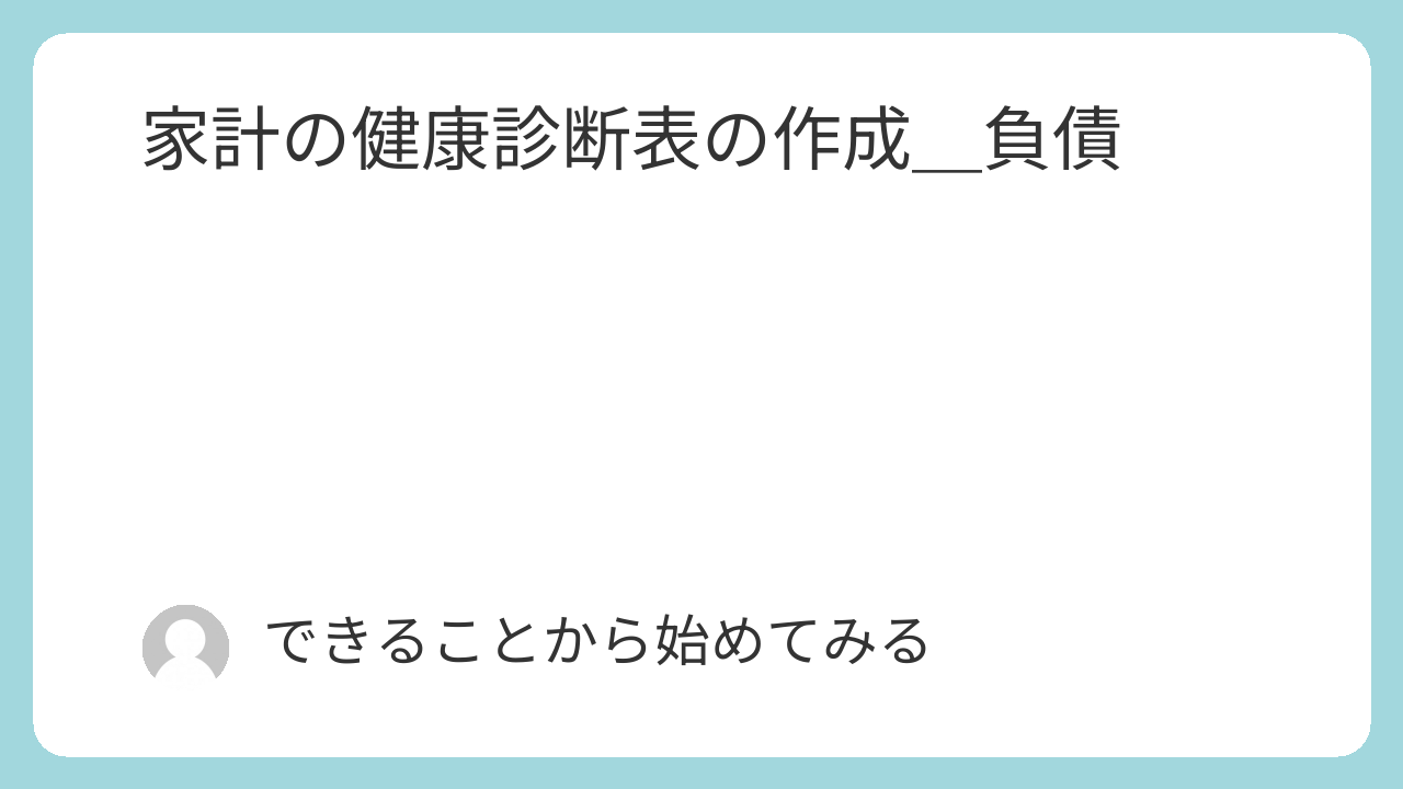 今回は、負債項目について具体的な記載金額を説明しました。家計の健康診断表を使って今後家計を管理していくと、毎月確認することは、上記負債であればクレジットカードの利用額とカードローンのみで、年に1回程度、住宅ローンを確認していきます。クレジットカードの利用額(おススメの方法の場合)とカードローンであれば、毎月数分程度で集計が可能となります。資産と合わせても慣れてくれば毎月10分程度で全て集計が可能になります。なんだかできそうな気がしてきませんか?そう思った方ぜひすぐに始めてみてください!私もそうですが、後でやろうとするとなかなか始められませんからね。